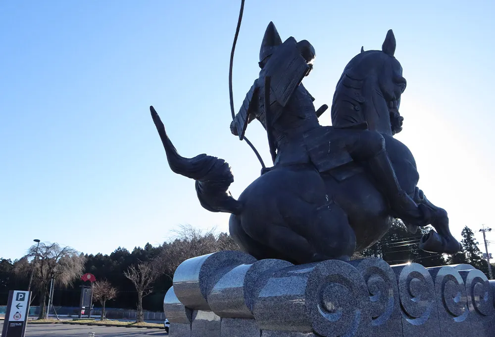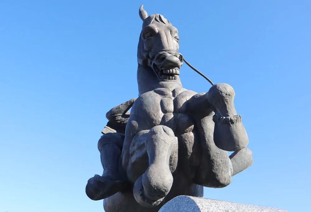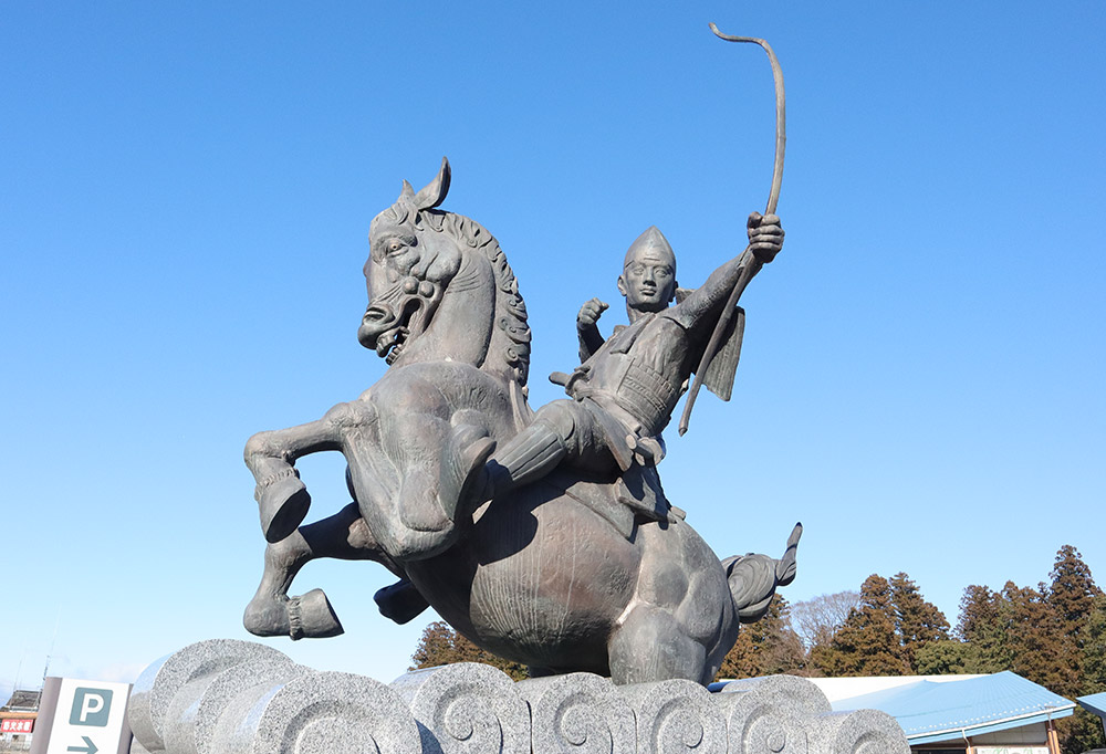荒れる波、馬にまたがって弓を構える那須与一像が狙う先には、ちゃんと扇の的が存在するのです。